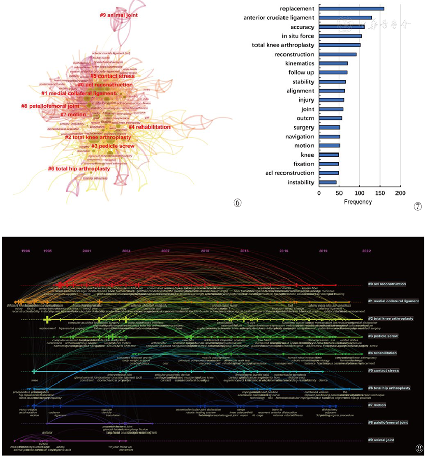 The literatures on the application of robots in orthopedics before April 2022 were searched through the "extended database of Science Citation Index" of wed of science, and the source data were counted and analyzed by bibliometric method. Use CiteSpace software to carry out visual transformation such as literature coupling analysis and co-occurrence analysis, to analyze the research status and trend of robot application in orthopedics.